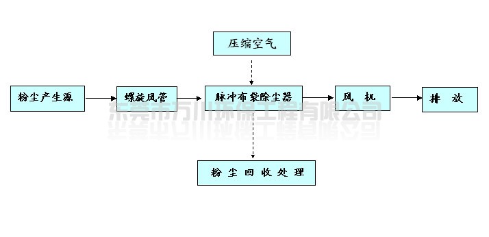 含塵廢氣在風機作用下,通過風管收集進入脈沖布袋除塵器,含塵廢氣進入中箱體下部,在擋風板形成預分離室內,粉塵因慣性作用落入灰斗。廢氣沿擋風板向上到達濾袋,粉塵被阻留在濾袋外面,干凈氣體進入袋內,并經過袋口和上箱體及風機再排出。