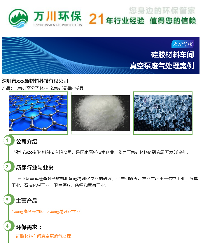 簡介: 深圳市xxx新材料科技有限公司,是國家高新技術(shù)企業(yè),致力于氟硅材料的研究及開發(fā)30余年。萬川環(huán)保受邀對硅膠材料加工車間真空泵廢氣進(jìn)行處理。本文介紹了硅膠材料真空泵廢氣處理中說使用的設(shè)備與方案。